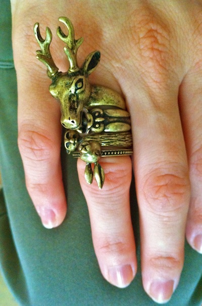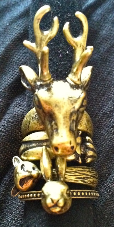 Et devinez sur quoi je suis tombée, avant-hier, en flânant chez mes camarades de H&M ? Ce collectif de bagues couleur cuivre, certainement destinées à être portées une par une… et qui m’ont tapé dans l’oeil. Bien entendu, je les porte toutes au même doigt…