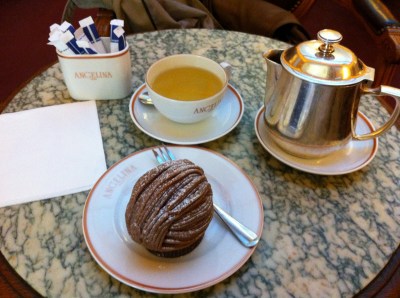 Et cet après-midi, trainant dans le quartier Tuileries (cela devient une habitude !), je n’ai pu résister à l’appel du palais, me trouvant à quelques mètres seulement du temple de Mont-Blanc, le très réputé Angelina. Le décor de ce salon de thé reste assez suranné, mais c’est finalement ce qui fait son charme. La population y est assez variée, puisque vous pouvez croiser les inévitables touristes, mais également des dames (de tout âges) très élégantes, voire même des hommes d’affaires.