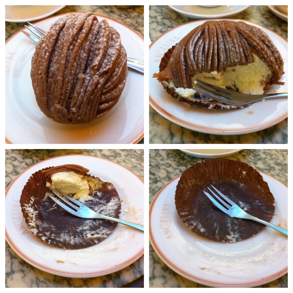 Je commandais donc mon fameux Mont-Blanc, accompagné d’un thé vert, histoire de ne pas gâcher toute la suavité du marron, une alliance découverte lors d’un séjour au Japon (toujours pour Pierre Hermé), et depuis adoptée.