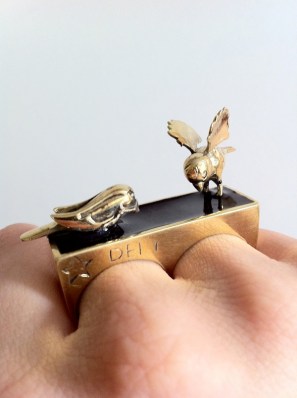 Aaargh… une bague à deux anneaux ! Ou mieux encore, un poing américain de poétesse, qui plus est, finement doré. Et croyez-moi, trouver de la fantaisie sans signe extérieur de vulgarité dans cette finition rococo, c’est tout un monde ! Sans oublier que cela impressionne ces messieurs du rugby (testée un jour de match au stade Yves-du-Manoir de Colombes… personne n’a moufté !).