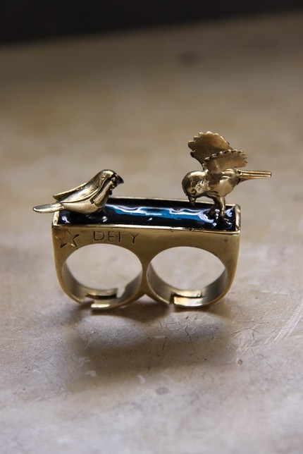Aaargh… une bague à deux anneaux ! Ou mieux encore, un poing américain de poétesse, qui plus est, finement doré. Et croyez-moi, trouver de la fantaisie sans signe extérieur de vulgarité dans cette finition rococo, c’est tout un monde ! Sans oublier que cela impressionne ces messieurs du rugby (testée un jour de match au stade Yves-du-Manoir de Colombes… personne n’a moufté !).