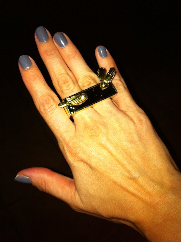 Bon, voici un cliché quelque peu nombriliste, histoire de vous montrer que je maîtrise l’art de l’anneau qui voit double. Cela rend très bien avec un vernis sombre, par exemple le fameux vert de Sephora dont je vous parlais précédemment, le Rouge Noir de Chanel, ou encore un beau bleu nuit…