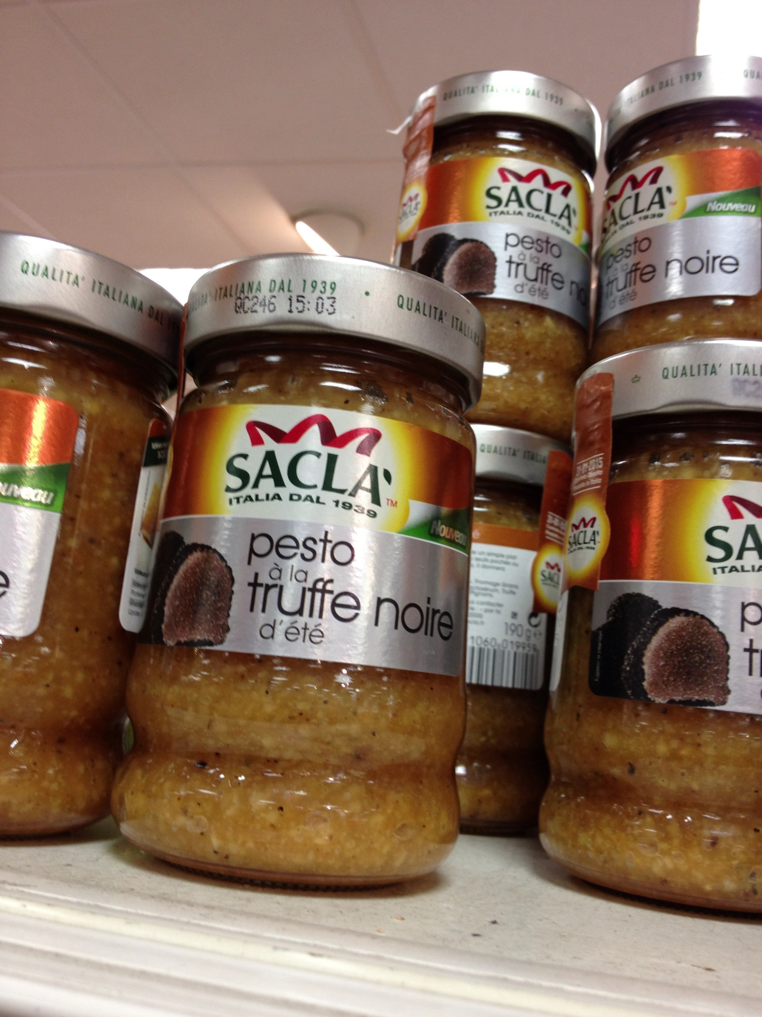 « Pesto à la truffe noire d’été« . Plutôt pâlichonne, la sauce, au premier abord. Mais mon sixième sens me conseille d’embarquer le trésor trouvé. Un seul pot pour rester raisonnable… en croisant les doigts qu’en cas de craquage sans retour, le ravitaillement ne fasse pas défaut. Retour à maison, avec un plan d’attaque bien en tête : linguine, lamelles de parmesan… et c’est tout ! Le menu du soir est arrêté, ne reste plus qu’à patienter…