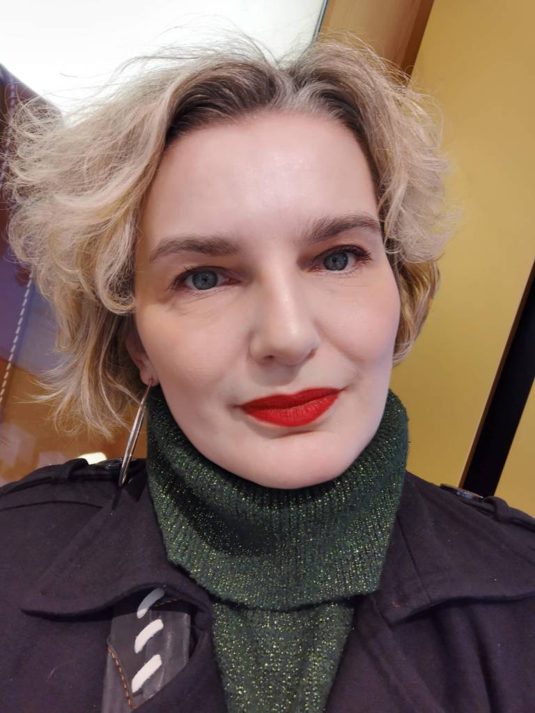 Tout d’abord, il faut éviter d’en mettre plusieurs couches, car il est bourré d’huiles (végétales, a priori), et sera moins joli si trop épais sur les lèvres. Cela permet aussi de lui donner le temps de sécher pour lui assurer une bonne tenue. Et qu’il prenne un fini quasi mat quelques minutes après avoir été appliqué. Je pense aussi que sa texture appelle à border les lèvres d’un crayon de la même tonalité. Quant à la tenue, elle est bonne, sans être extraordinaire (il ne passera pas la case du déjeuner un peu gras) et le fini est vraiment fin et joli. La couleur choisie aide sans doute aussi… Voyez la photo !