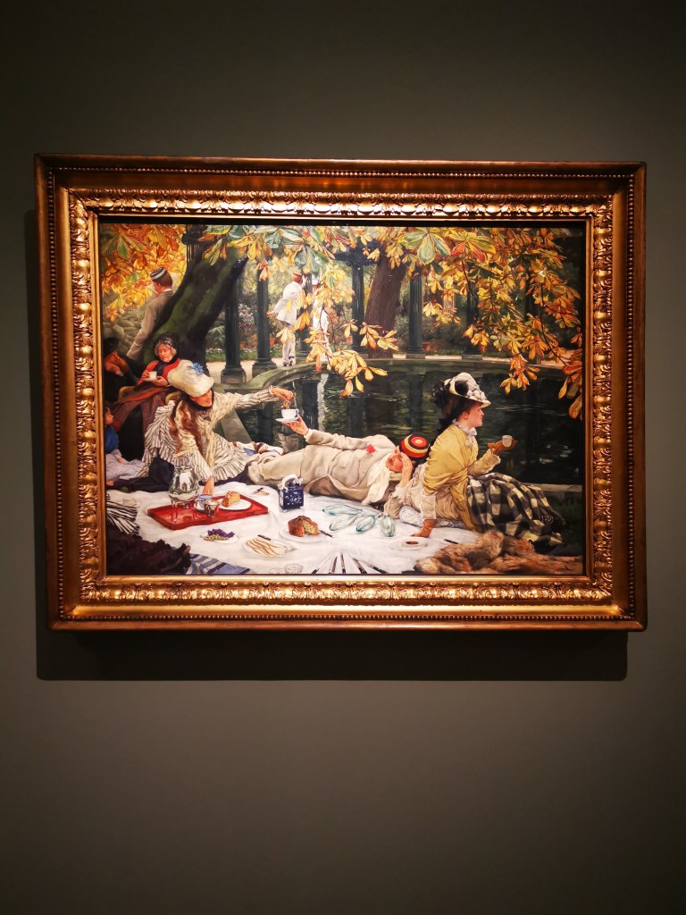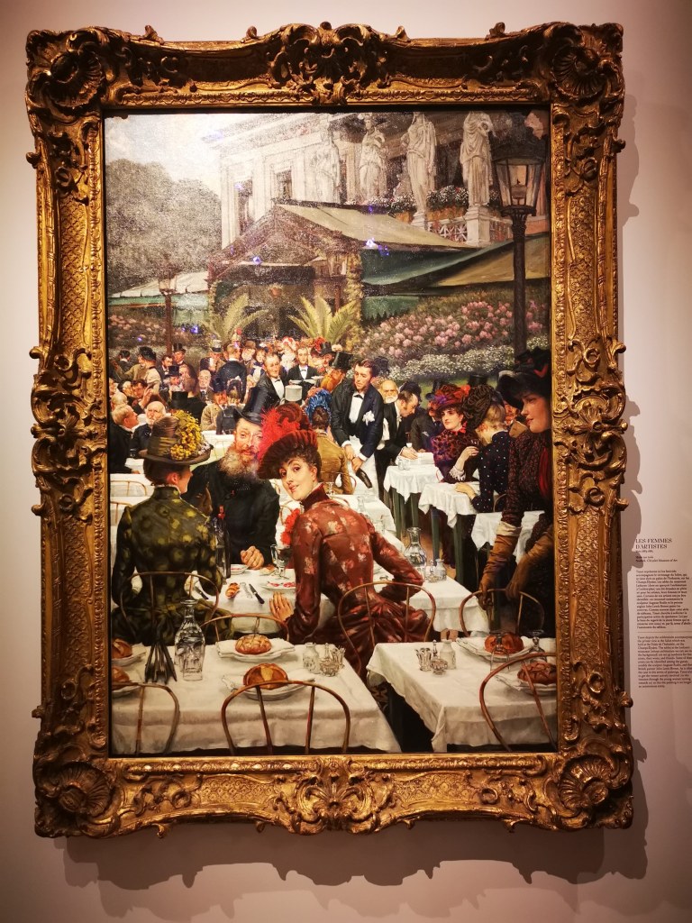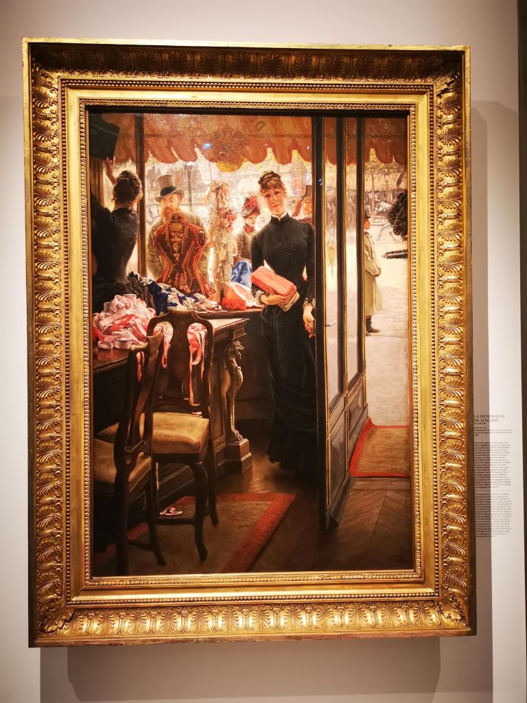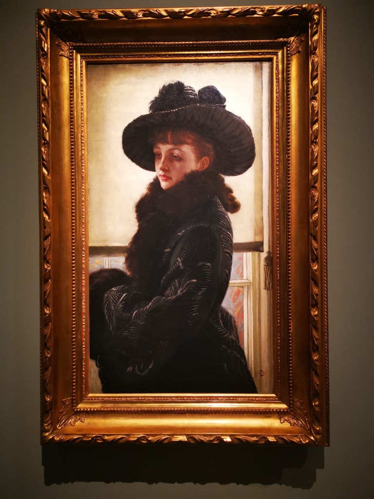 Je suis un peu sur courant alternatif concernant ce musée. J’adore le bâtiment, remarquablement rénové et aménagé pour accueillir le fleuron de l’art occidental de la seconde moitié du XIXe siècle à l’avant Première guerre mondiale. L’espace dédié aux collections permanentes est un régal pour les yeux, remarquablement mis en scène pour pouvoir apprécier avec le recul et l’espace nécessaire chaque chef d’œuvre des lieux. Par contre, les expositions temporaires sont hélas confinées dans une aile du musée, étroite et basse de plafond, qui me fait toujours sentir mal à l’aise, collée aux autres visiteurs, et n’offrant pas assez de recul sur l’ensemble de l’accrochage. C’est pour cela que je l’ai beaucoup boudé ces dernières années ; mon sentiment s’était confirmé quand je m’étais rendue en octobre dernier à l’exposition Degas à Paris. Elle était superbe, et cela, je n’en aurait jamais douté. Mais il y avait tant de monde et si peu d’espace pour apprécier les œuvres ! Et je vous parle d’un temps où l’on pouvait se coller sans problème à son voisin… C’est sans doute grâce à la mise en place des gestes barrières que j’ai décidé de me rendre à l’exposition James Tissot, l’ambigu moderne, et ainsi vivre cette visite dans des conditions bien plus agréables.